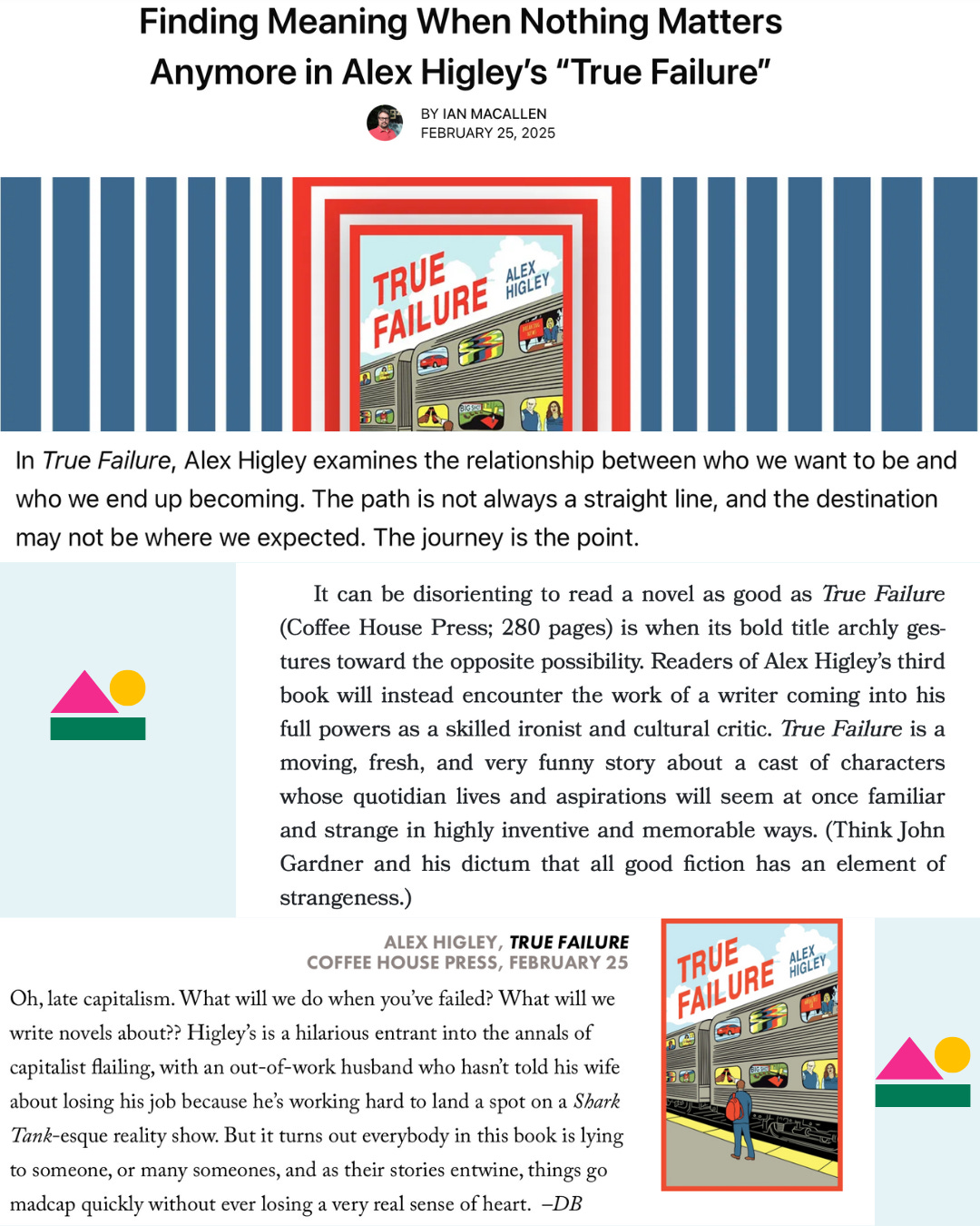 We’re so excited about the release of Alex Higley’s TRUE FAILURE. We launched the novel (not into space, but close) at P&T Knitwear and had a great time.